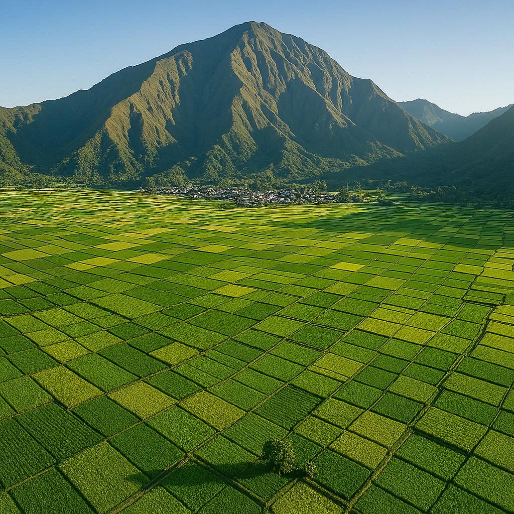 Petak-petak sawahnya itu rapi, berlayer, dengan warna hijau yang beda-beda.