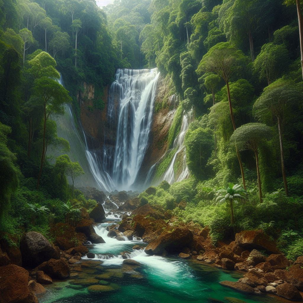 Gak tinggi-tinggi amat, mungkin sekitar 10–12 meter. Tapi debit airnya deras, dan jatuhnya langsung ke kolam jernih berwarna kehijauan.