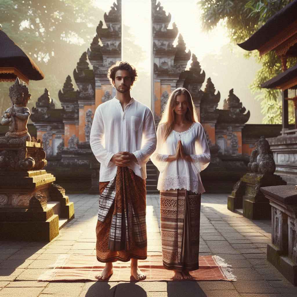 Ini semacam penanda bahwa lo “siap” masuk ke area sakral. Di banyak tradisi Bali dan Lombok, selendang juga dipercaya sebagai pengikat energi agar tetap netral. - Jangan pakai baju hitam atau merah mencolok
