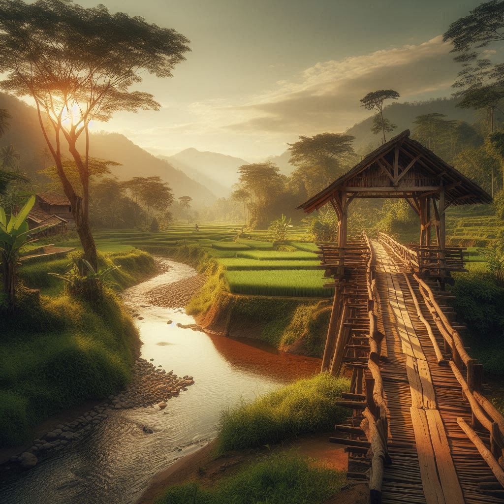 Langkah pertama gue di atas papan kayu itu langsung ngebuat gue berhenti. Bukan karena takut jembatannya ambruk (meski emang keliatan tua), tapi karena suasananya kayak narik balik ke masa kecil.