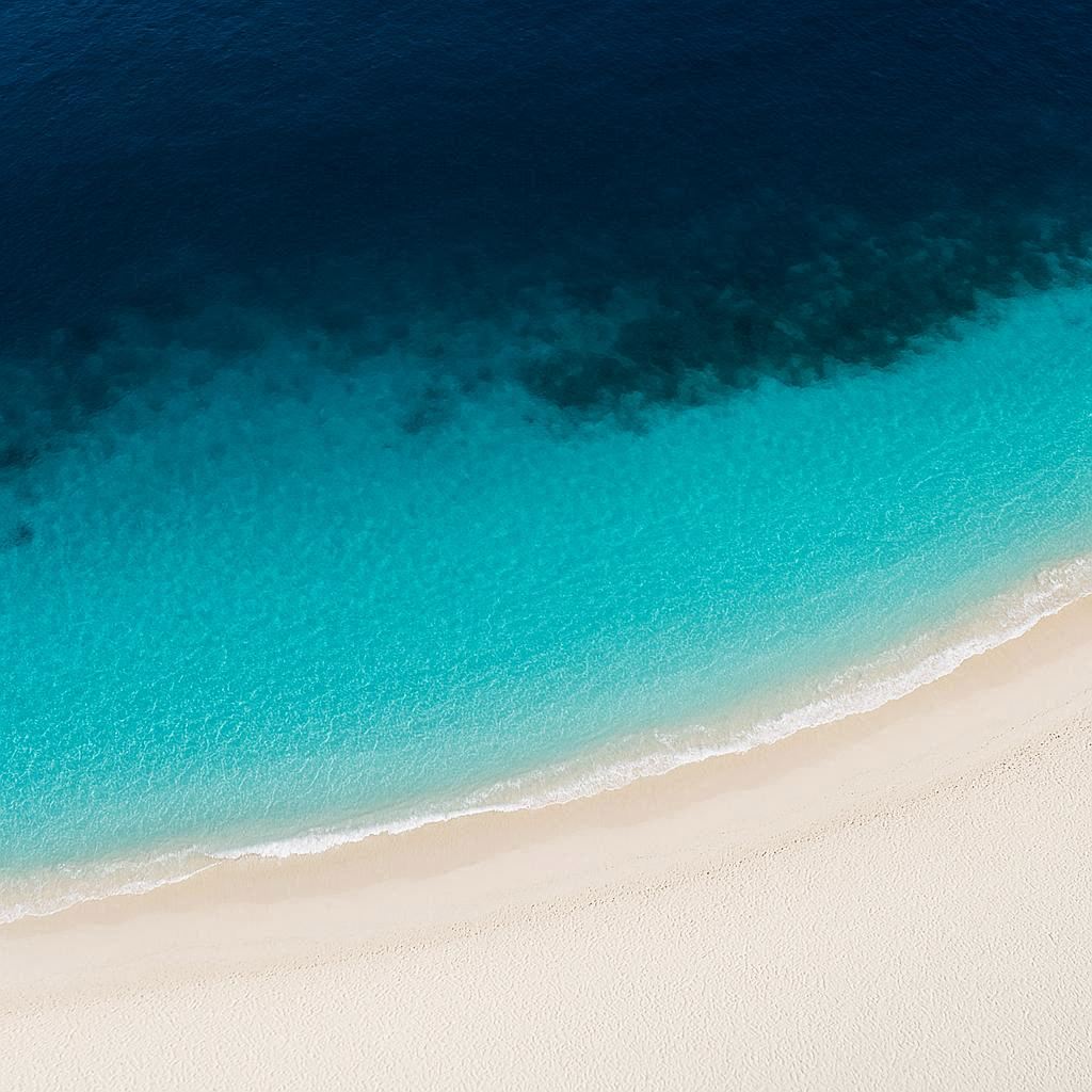 Ini favorit banyak pilot drone. Airnya dua warna. Biru tua dan toska terang, terpisah alami. Dari atas kelihatan seperti gradasi cat air. Kalau lagi sepi, jejak kaki di pasir putihnya jadi detail kecil yang bikin frame makin hidup.