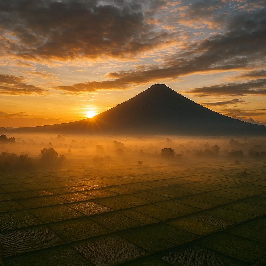 Lo berdiri di atas, lihat sawah kotak-kotak kayak puzzle raksasa, kabut tipis gantung malu-malu, dan siluet Gunung Rinjani di belakang.