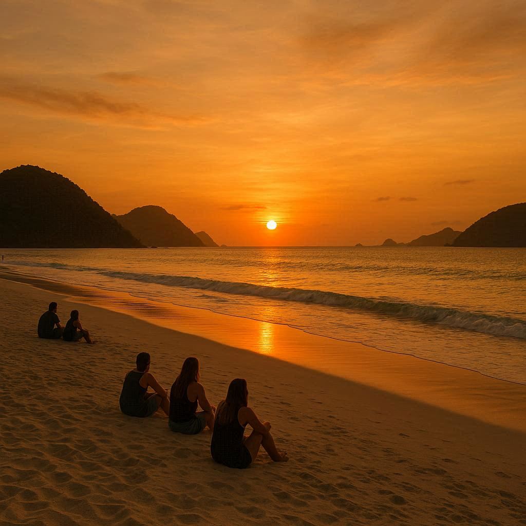 Pas matahari turun, siluet orang-orang yang duduk di pinggir pantai kelihatan estetik banget.
